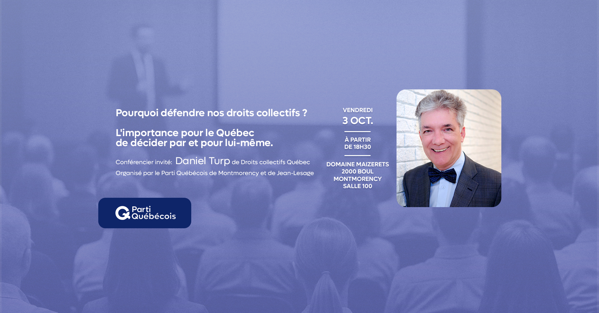 Organisé par le Parti Québécois de Jean-Lesage et le Parti Québécois de Montmorency, cette conférence de Daniel Turp, de Droits collectifs Québec, est OUVERTE À TOUS ET TOUTES et portera sur nos droits collectifs comme peuple.