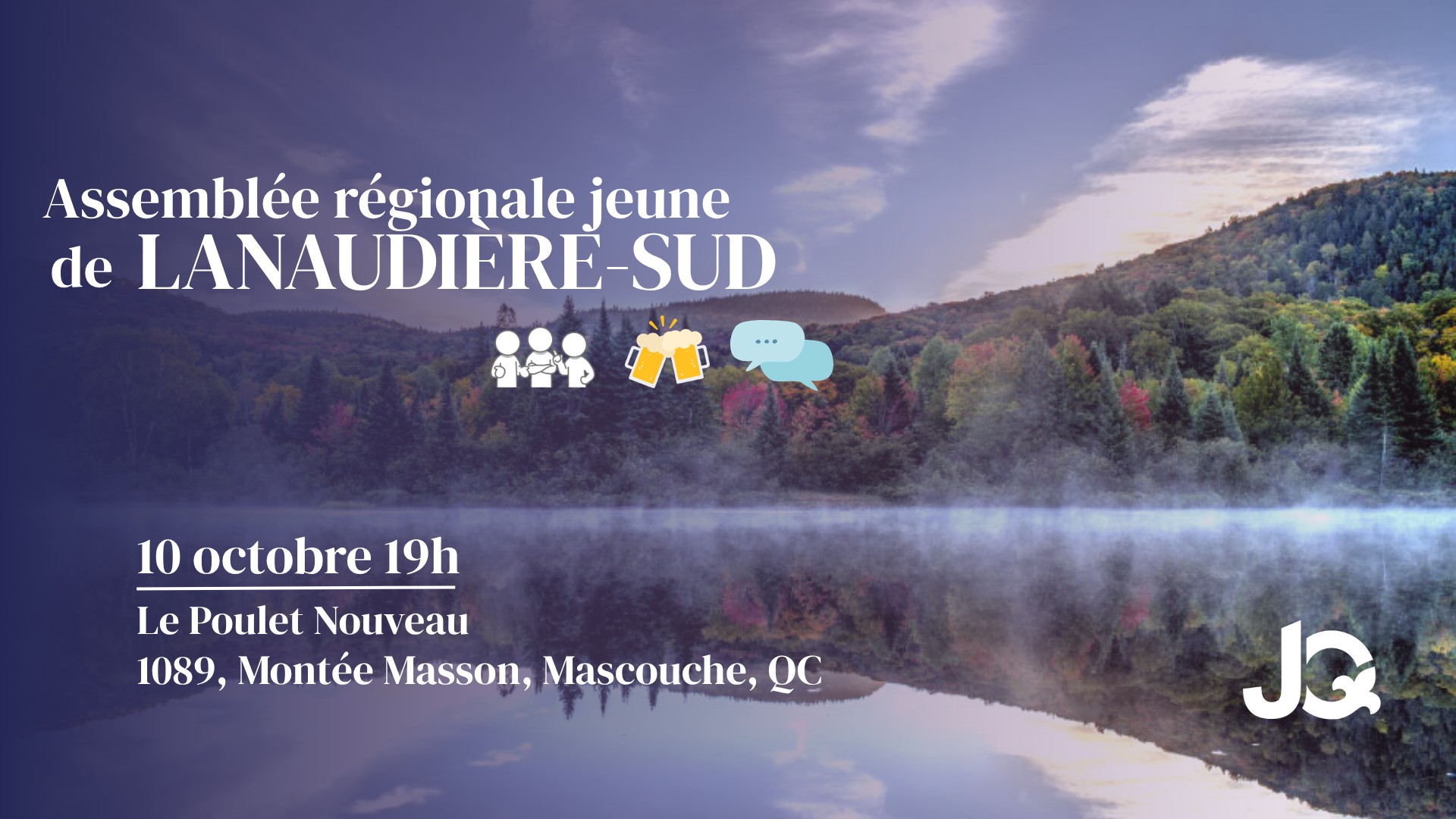 C’est avec excitation que nous vous annonçons la tenue d’une Assemblée régionale jeune dans la région de Lanaudière-Sud. Vous aurez l’occasion de parler et de débattre d’enjeux importants concernant des enjeux régionaux ou nationaux. De plus, une élection pour le poste de présidence régionale de cette même région aura lieu. Si vous avez un quelconque intérêt pour ce poste, vous pouvez demander un bulletin de candidature à l’adresse électronique suivante : infocnj@pq.org.