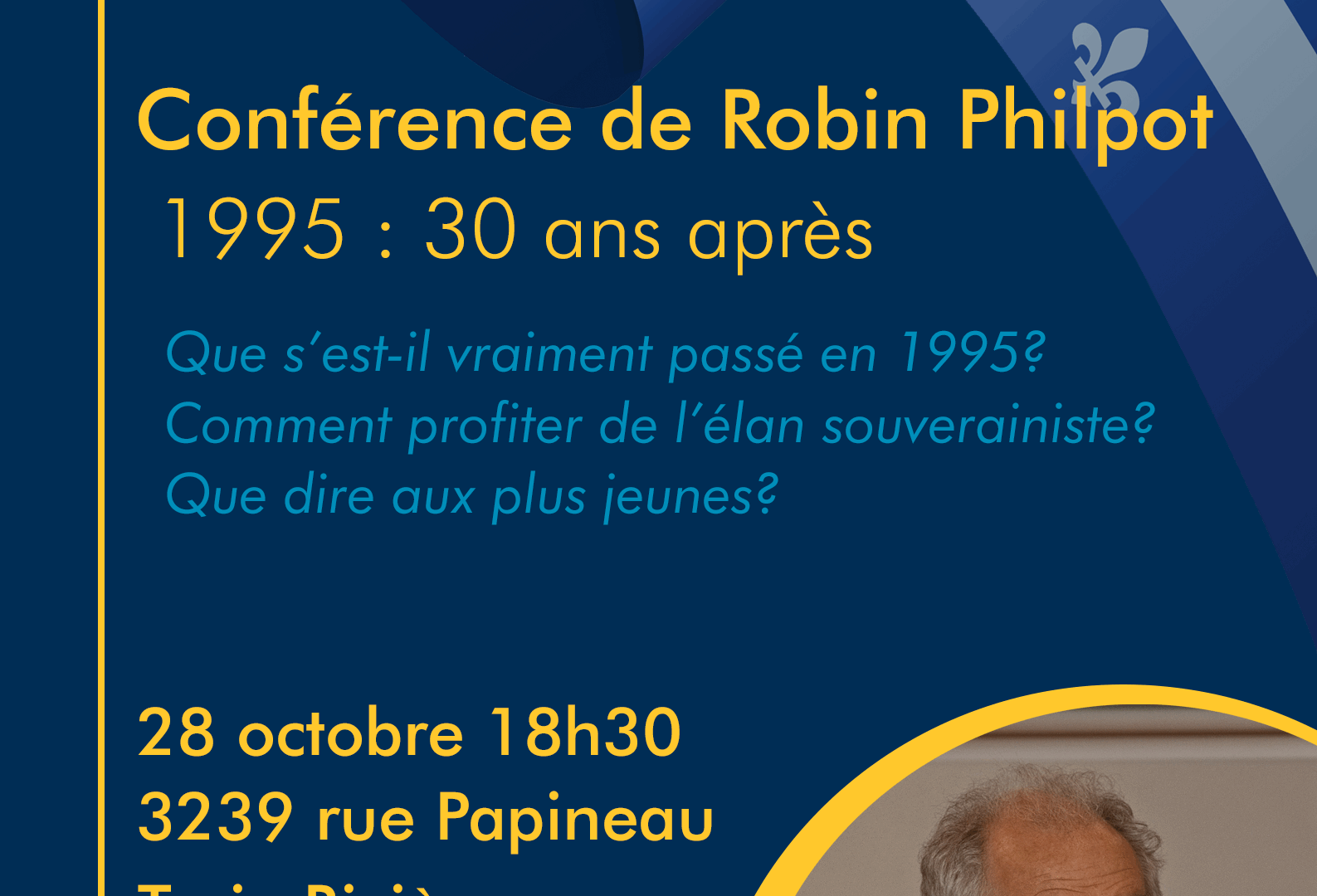 Le journaliste, essayiste et auteur Robin Philpot sera de passage à la salle Georges-Meyers de la SSJB de la Mauricie le mardi 28 octobre à 18h30 pour une conférence exceptionnelle marquant le 30ᵉ anniversaire du référendum de 1995.